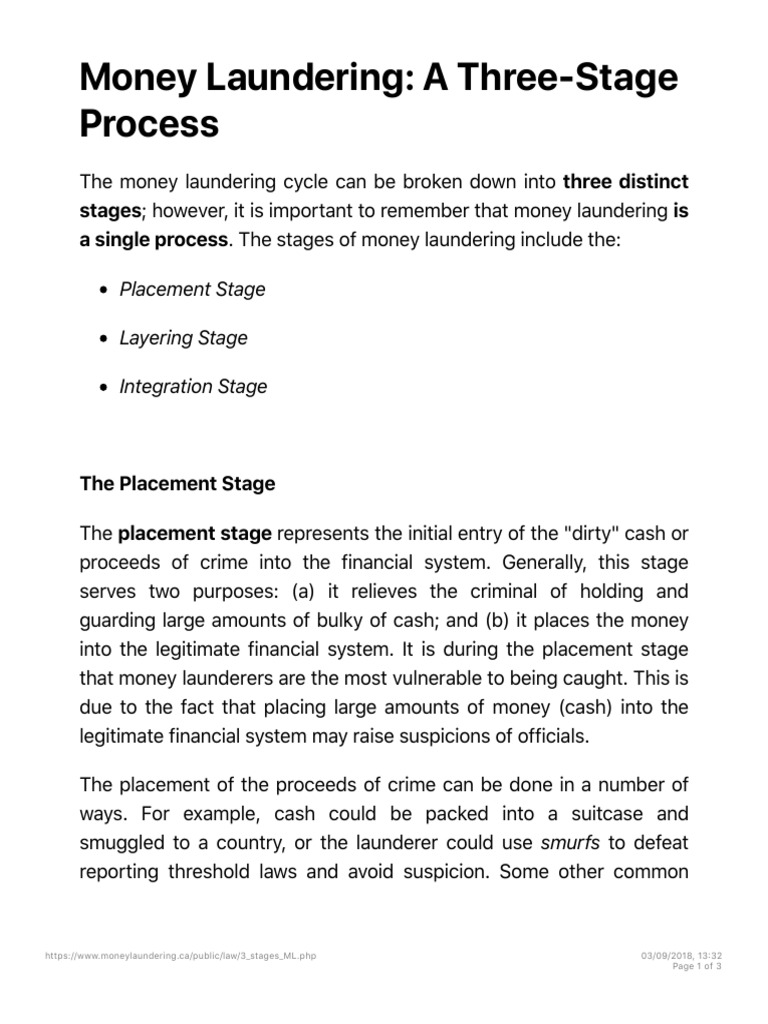 There are many variants of money laundering, which range from the very simple to the creatively complex. This is the physical deposit of cash proceeds from illegal activities into an fi. Money laundering typically includes three stages: In this stage, the criminal relieves himself of holding and guarding large amounts of bulky cash, and the money is placed into. The phases of the process often overlap with each other, happening simultaneously in one transaction.